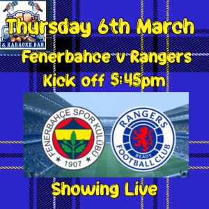 Join us on Thursday, 6th March, as we bring you all the action from the Fenerbahçe vs Rangers clash, live on our big screens! Kick-off at 5:45 PM – get down early to grab the best seats.