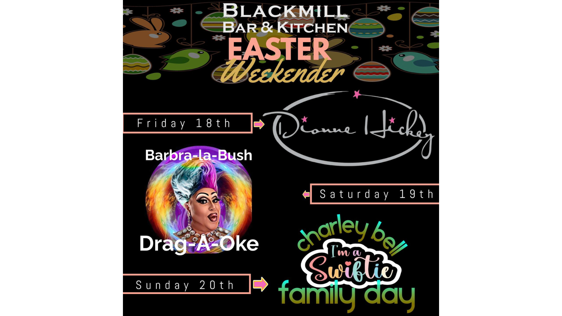 SUNDAY 20TH APRIL – Charley Bell I’m a Swiftie Family Day! A Taylor Swift-inspired fun-filled day for families, kids & Swifties alike! Charley Bell’s I’m a Swiftie Show – Sing along to all the hits!Easter Egg Hunt – Fun for the little ones!Family-friendly vibes all afternoonFree entry!