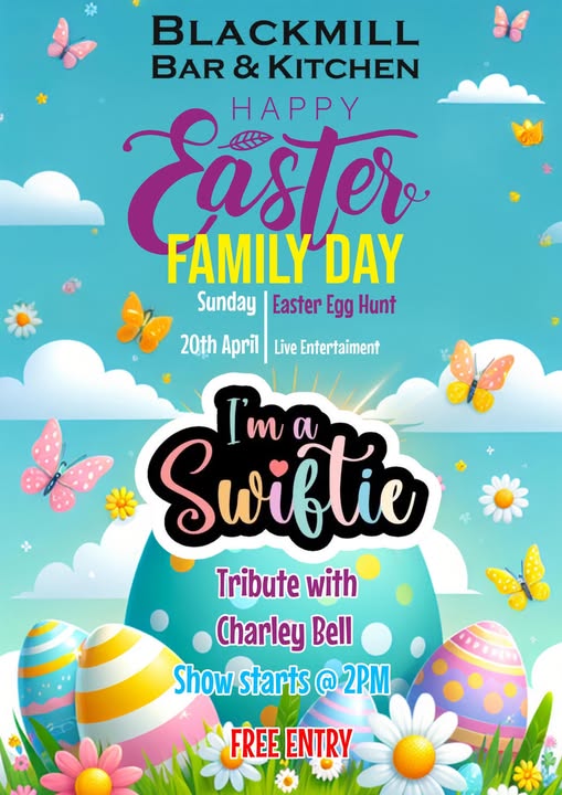 Hop on over to The Blackmill for an Easter Family Fun Day on Sunday, 20th April!  Easter Egg Hunt  Live Entertainment  Show starts at 2pm FREE Entry – fun for the whole family! Don’t miss out on a cracking day of Easter fun!